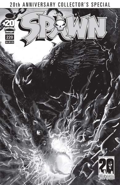Commemorate 20 Years of SPAWN with this unique black and white recreation of the hallmark 220th issue.