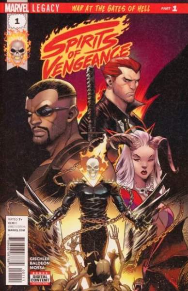 WAR AT THE GATES OF HELL Part 1 A dead angel. A silver bullet. A kept promise. For ages, the war between Heaven and Hell raged in the unseen corners of society, both sides in delicate balance that could topple if the right weapons were in the wrong hands... When an undercover angel is murdered, Johnny Blaze, the Ghost Rider, must find the killers and punish them...But this time he won't do it alone: A deadly team must rise from the darkest depths of the Marvel Universe to form an unholy alliance - HELLSTORM! SATANA! BLADE! They are the SPIRITS OF VENGEANCE! PLUS: Includes 3 bonus MARVEL PRIMER PAGES! Story by Robbie Thompson and TBA!