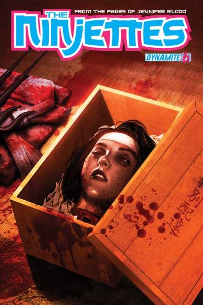 The Ninjettes are dead -- long live the Ninjettes! After the apocalyptic events of Jennifer Blood #4, Kelly Hara is a headless corpse in a wooden box! But for how long? One dead cast member will make a shocking return from the grave in this issue, and we might just be shameless enough to make it her!