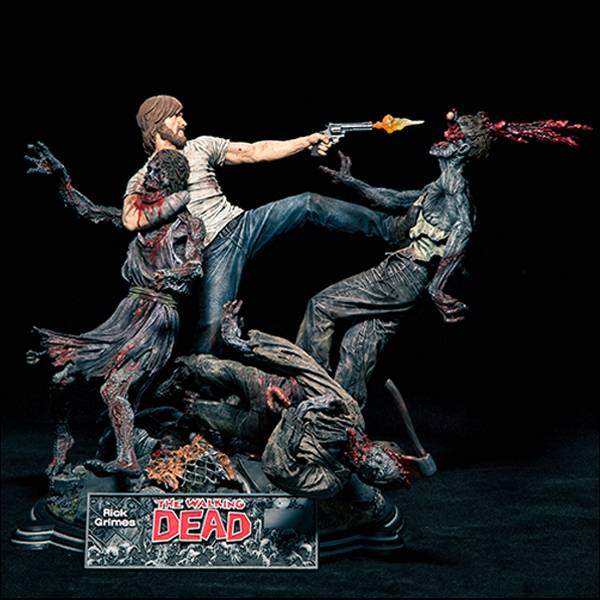 Hardened by killing and loss, a harsher, tougher Rick Grimes has emerged from the rubble of this post-apocalyptic world. This limited-edition statue depicts Rick, in a desperate struggle against the endless wave of the undead. Rick single-handedly exterminates a hoard of zombie threats in his unyielding mayhem! Standing over 14 inches tall and displaying heart-stopping action, this hand-painted statue includes every eyeball-popping, brain-splitting, and gun-blazing detail in full color. Each statue also includes a highly detailed individually numbered plaque, 360 degree rotating base, and certificate of authenticity signed by both Robert Kirkman and Todd McFarlane.